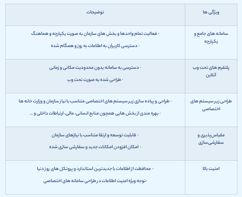 از طرفی تیم ایراکد این امکان را به سازمان ها میدهد تا به منظور ایجاد هماهنگی و امکان مدیریت متمرکز بتوانند بر اساس ساختار و عملکرد هر سازمان زیر سیستم های اختصاصی با قابلیت های خاص طراحی و ایجاد نمایند.از ویژگی های کلیدی طراحی سامانه های اختصاصی سازمانی توسط ما میتوان به موارد زیر اشاره کرد: